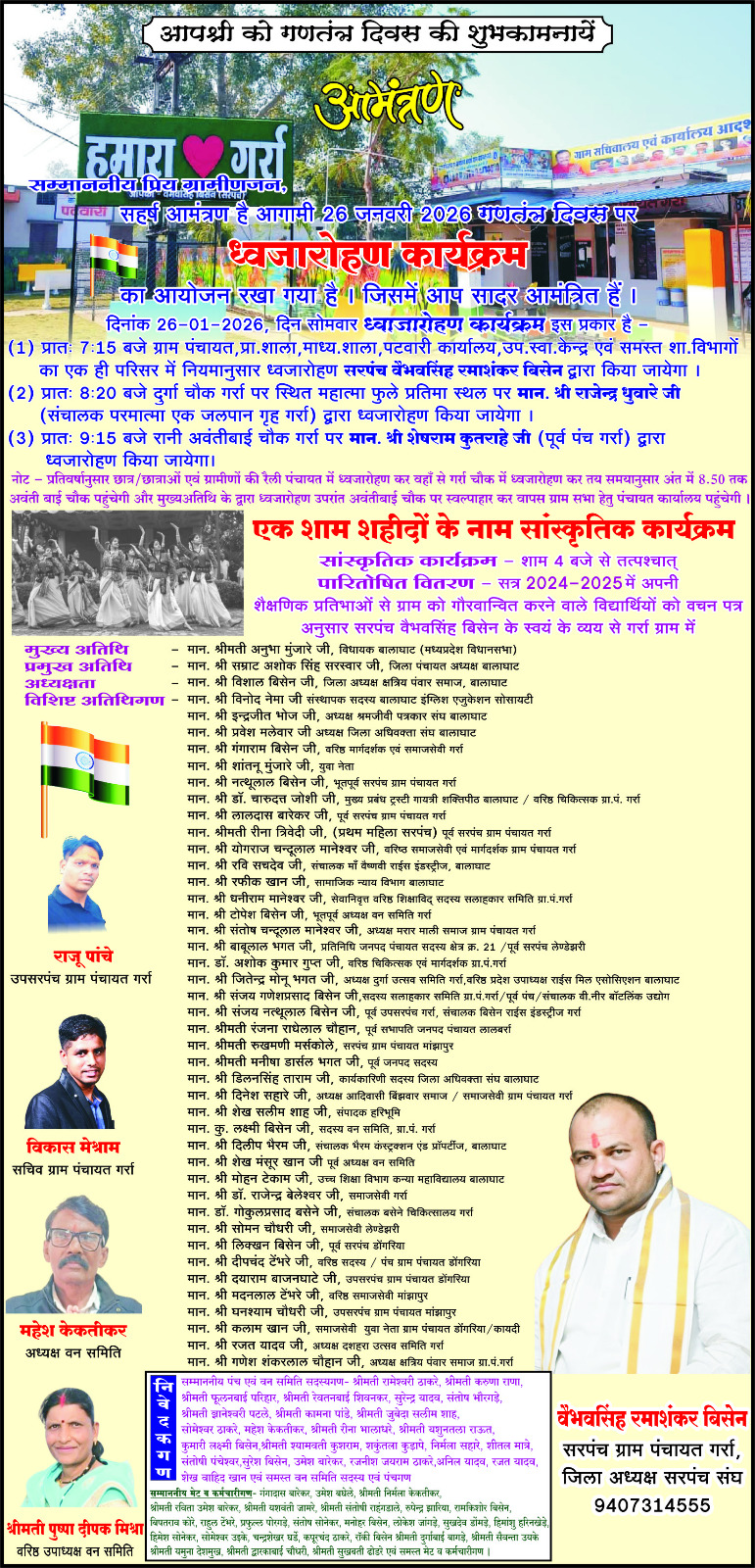 नायक दर्पण/बालाघाट। ••••••••••••••••••••••••••• आदर्श ग्राम पंचायत गर्रा में 26 जनवरी 2026 को गणतंत्र दिव...