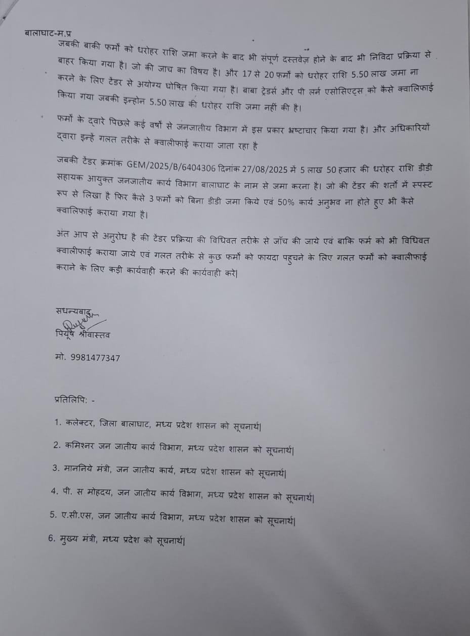 संयुक्त कांति पार्टी के राष्ट्रीय अध्यक्ष और पूर्व विधायक किशोर समरीते ने आदिवासी विकास विभाग में भ्रष्टाचार के आरोप लगाते हुए मुख्य सचिव अनुराग जैन से जांच की मांग की है। समरीते ने आरोप लगाया है कि मध्यप्रदेश में आयुक्त आदिवासी विकास और सहायक आदिवासी विकास कार्यालयों में जेम के माध्यम से सामग्री खरीदी में व्यापक भ्रष्टाचार किया गया है। श्री समरीते ने अपने पत्र में कहा है कि बालाघाट, मण्डला, सिवनी, खण्डवा, छिंदवाड़ा, बैतूल, अलीराजपुर, झाबुआ में काफ ी गंभीर अनियमितता की गई है। उन्होंने सहायक आयुक्त आदिवासी विकास कार्यालय बालाघाट में जेम से रोटी बनाने की मशीन खरीदी में की गई अनियमितता की शिकायत पत्र के साथ संलग्न की है। श्री समरीते ने कहा है कि वर्ष 2022 से मण्प्रण्के आदिम जाति कल्याण विभाग में सौर उर्जा से चलने वाले वाटर हिटर लगाने 200 करोड़ रूपये सभी जिलों के सहायक आयुक्तों को दिया गया हैए लेकिन कहीं भी सौर उर्जा के वाटर हीटर नहीं लगे हैं। बच्चे ठण्डे पानी में स्नान कर रहे हैं। उन्होंने इस मामले की बालाघाट जिला सहित सभी 55 जिले में जांच करवाने की मांग की है।