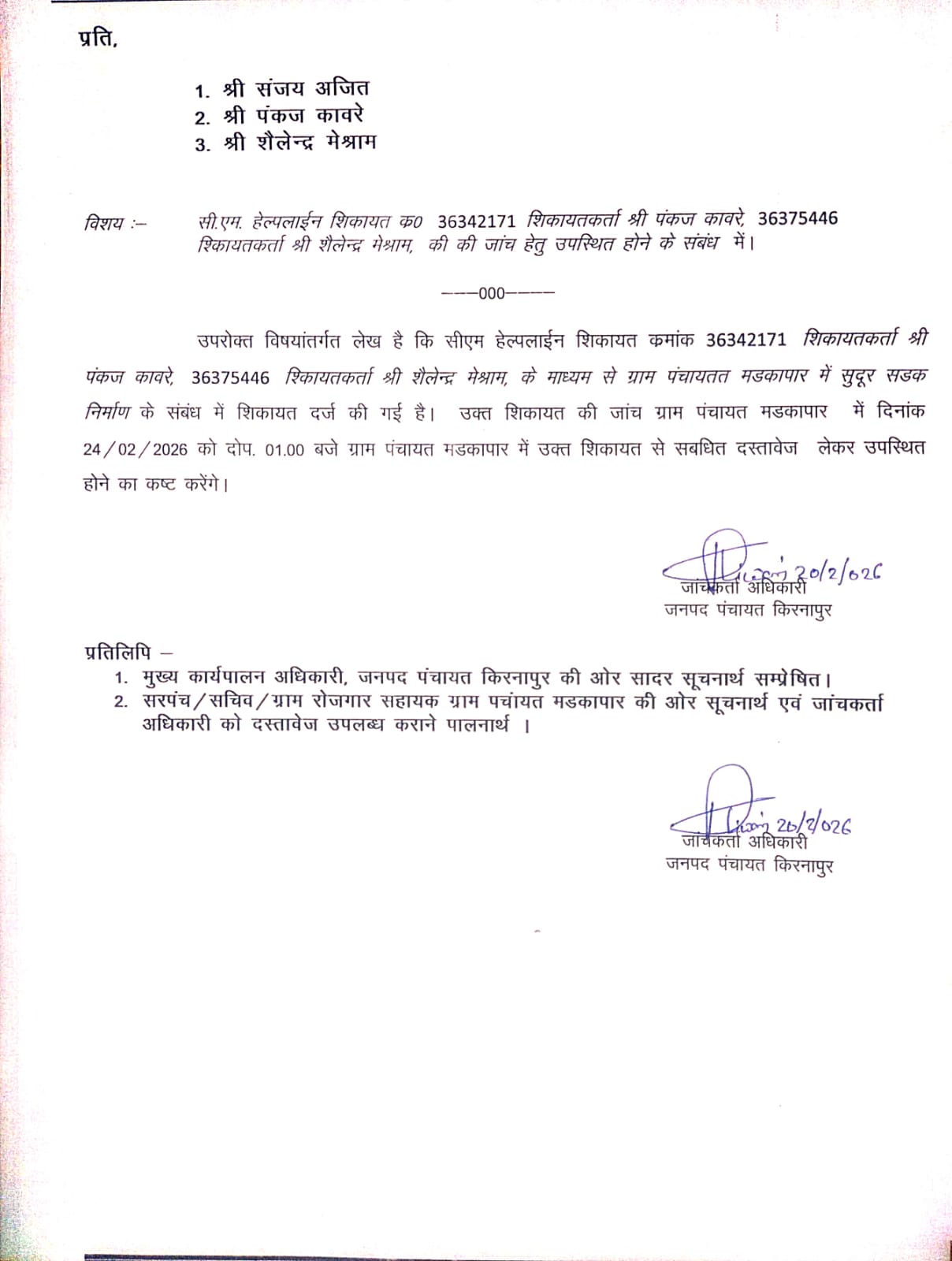 जारी पत्र के अनुसार 24 फरवरी 2026 को दोपहर 1 बजे ग्राम पंचायत मड़कापार में उक्त शिकायत की जांच की जाएगी। जांच अधिकारी, जनपद पंचायत किरनापुर द्वारा शिकायतकर्ताओं को संबंधित दस्तावेजों के साथ उपस्थित होने के निर्देश दिए गए हैं। साथ ही सरपंच, सचिव एवं ग्राम रोजगार सहायक को भी आवश्यक अभिलेख प्रस्तुत करने के लिए कहा गया है।