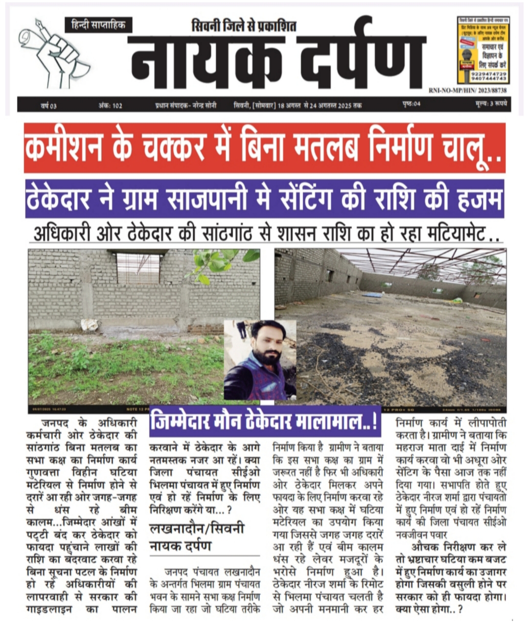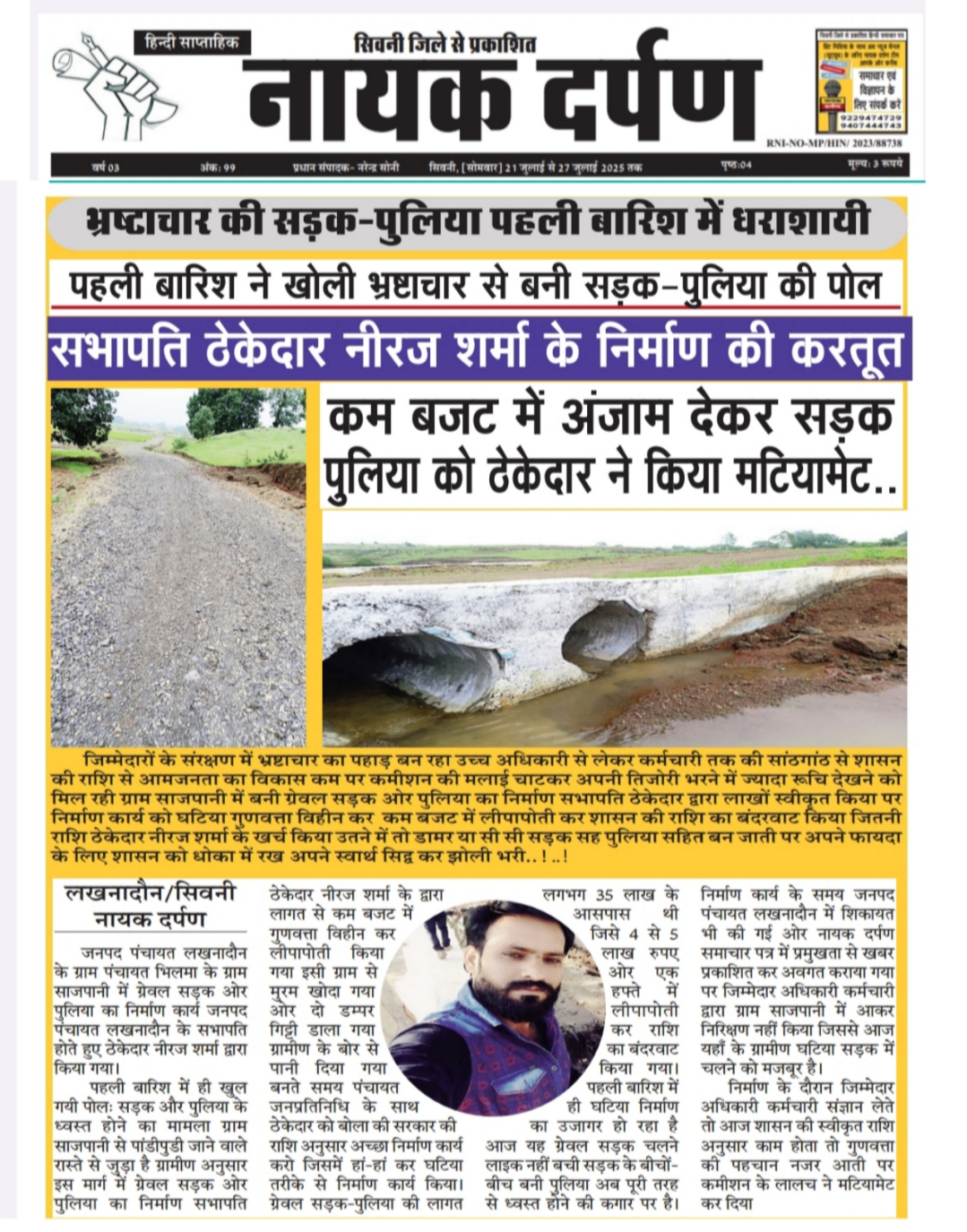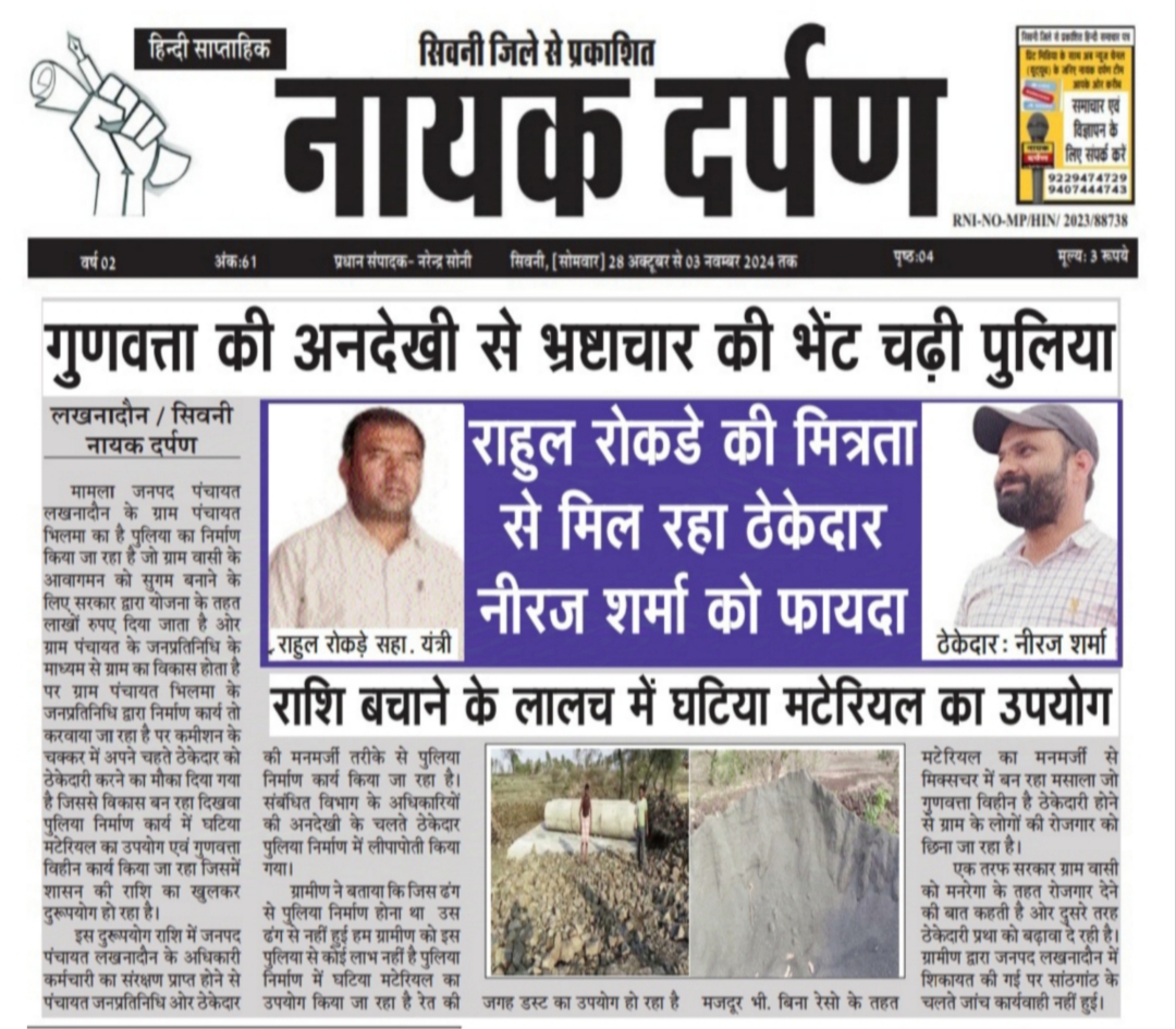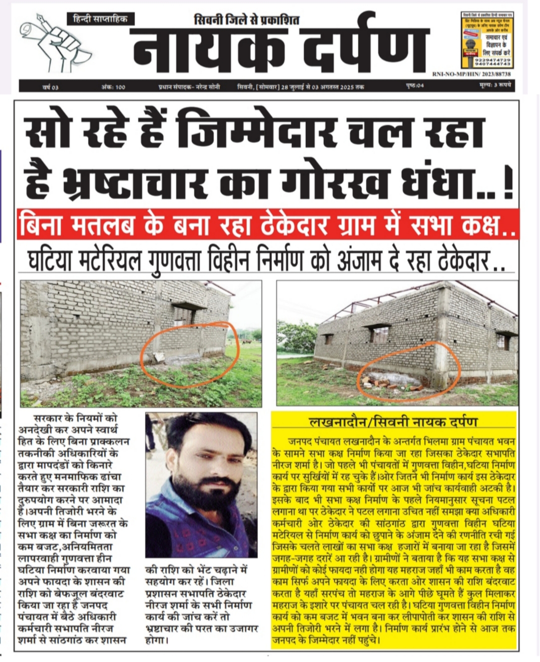 जनपद पंचायत लखनादौन के अंतर्गत ग्राम पंचायतों निर्माण में भारी अनियमितता किया गया जिम्मेदार अधिकारियों की मिलीभगत से ठेकेदार नीरज शर्मा द्वारा घटिया सामग्री का उपयोग कर निर्माण कार्यो को अंजाम दिया है जिससे सरकारी राशि का खुला दुरुपयोग हुआ।