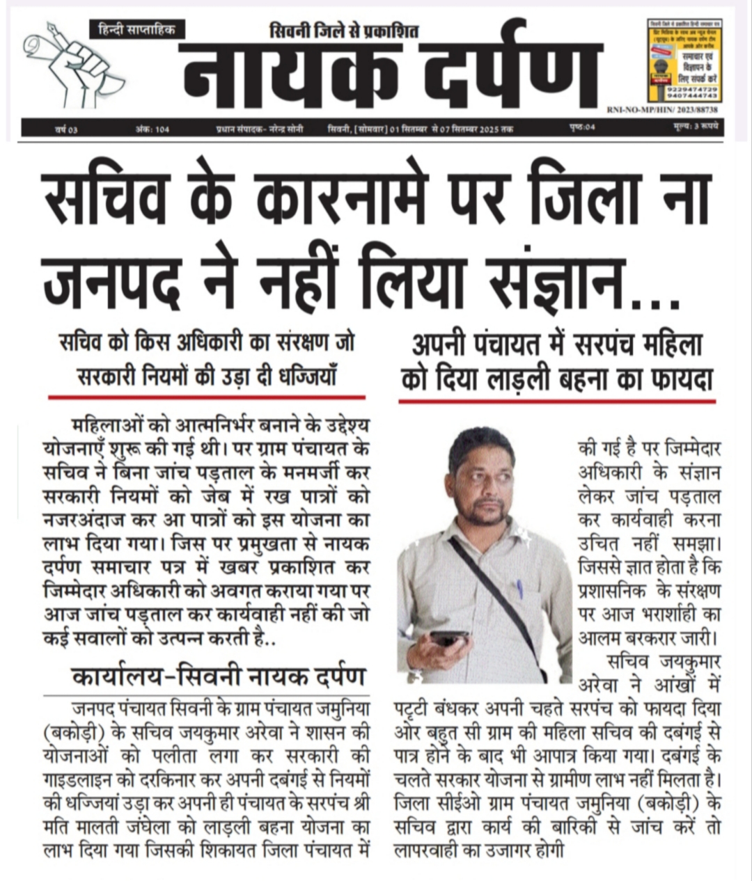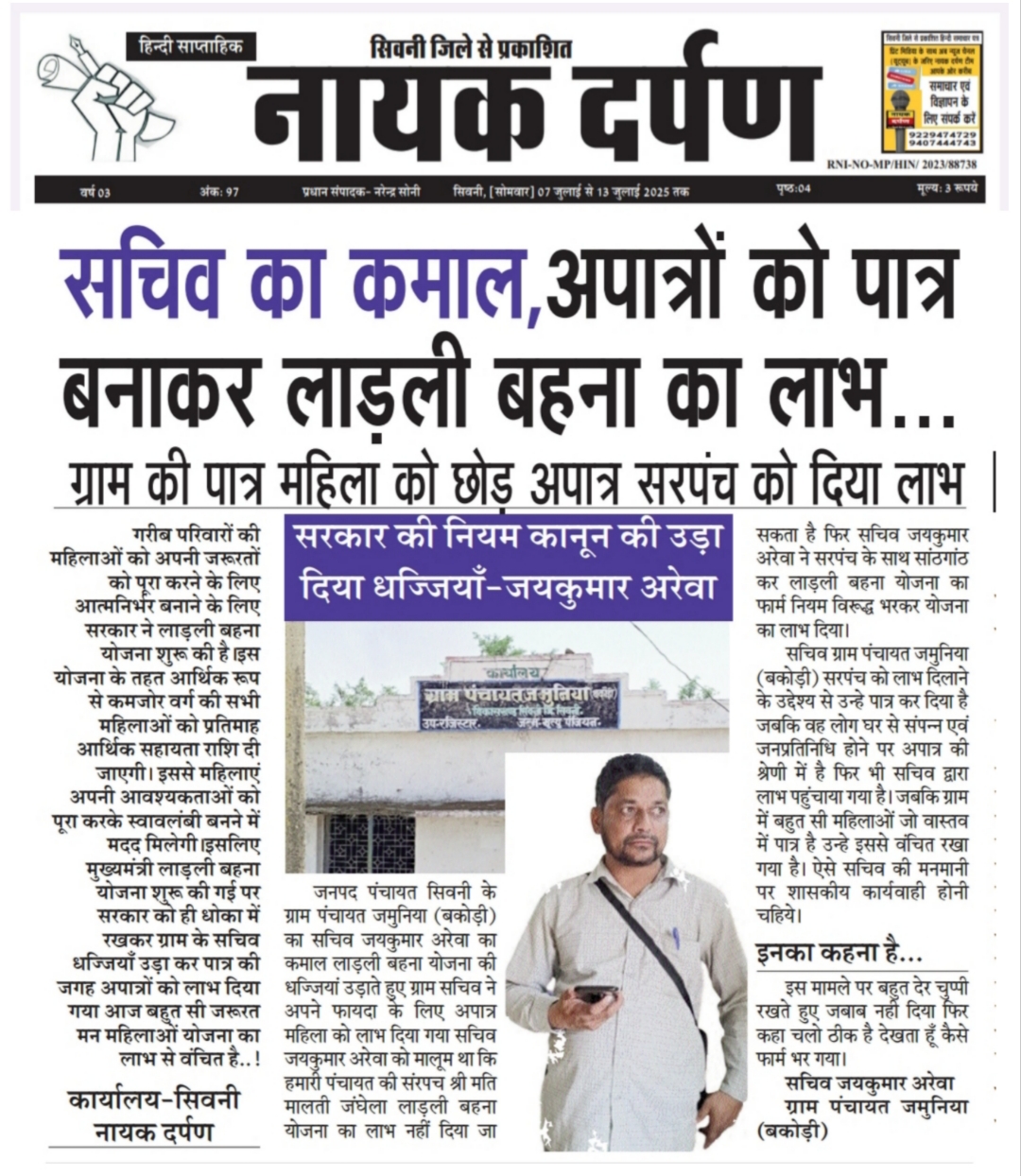 जनपद पंचायत सिवनी की ग्राम पंचायत जमुनिया (बकोड़ी) में सरपंच मालती जंघेला ने खुद लाड़ली बहना योजना का लाभ लिया जब कि ग्राम पंचायत में सरपंच का इसलिए जिता लाया जाता है कि ग्राम का विकास ओर जरूरतों तो लाभ दिलाईगी लेकिन यहाँ पर सचिव जयकुमार अरेवा ने नियमों की धज्जियां उड़ा कर सरपंच मालती जंघेला को लाभ दिया गया। जबकि शासन की गाइडलाइन में स्पष्ट रूप से प्रावधान है कि जनप्रतिनिधियों को इसका लाभ नहीं दिया जा सकता फिर लाभ लिया