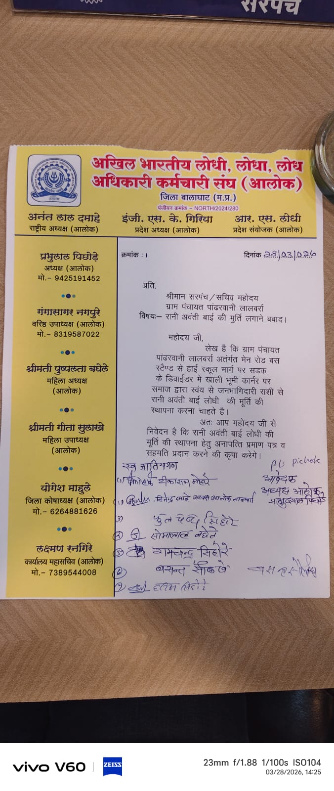 लालबर्रा तहसील मुख्यालय लालबर्रा की ग्राम पंचायत पांडरवानी में लोधी समाज ब्लॉक लालबर्रा द्वारा वीरांगना रानी अवंती बाई लोधी की मूर्ति स्थापना को लेकर सरपंच अनीस खान को ज्ञापन सौंपा गया। समाज के प्रतिनिधियों ने नगर मुख्यालय में प्रेरणास्रोत रानी अवंती बाई की प्रतिमा स्थापित करने की मांग रखते हुए इसे समाज की आस्था और गौरव से जुड़ा विषय बताया।