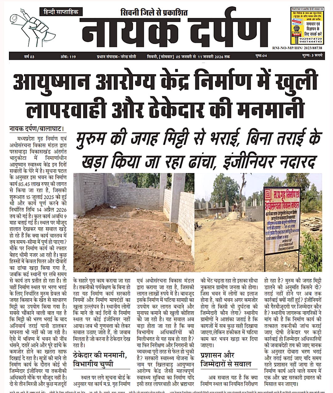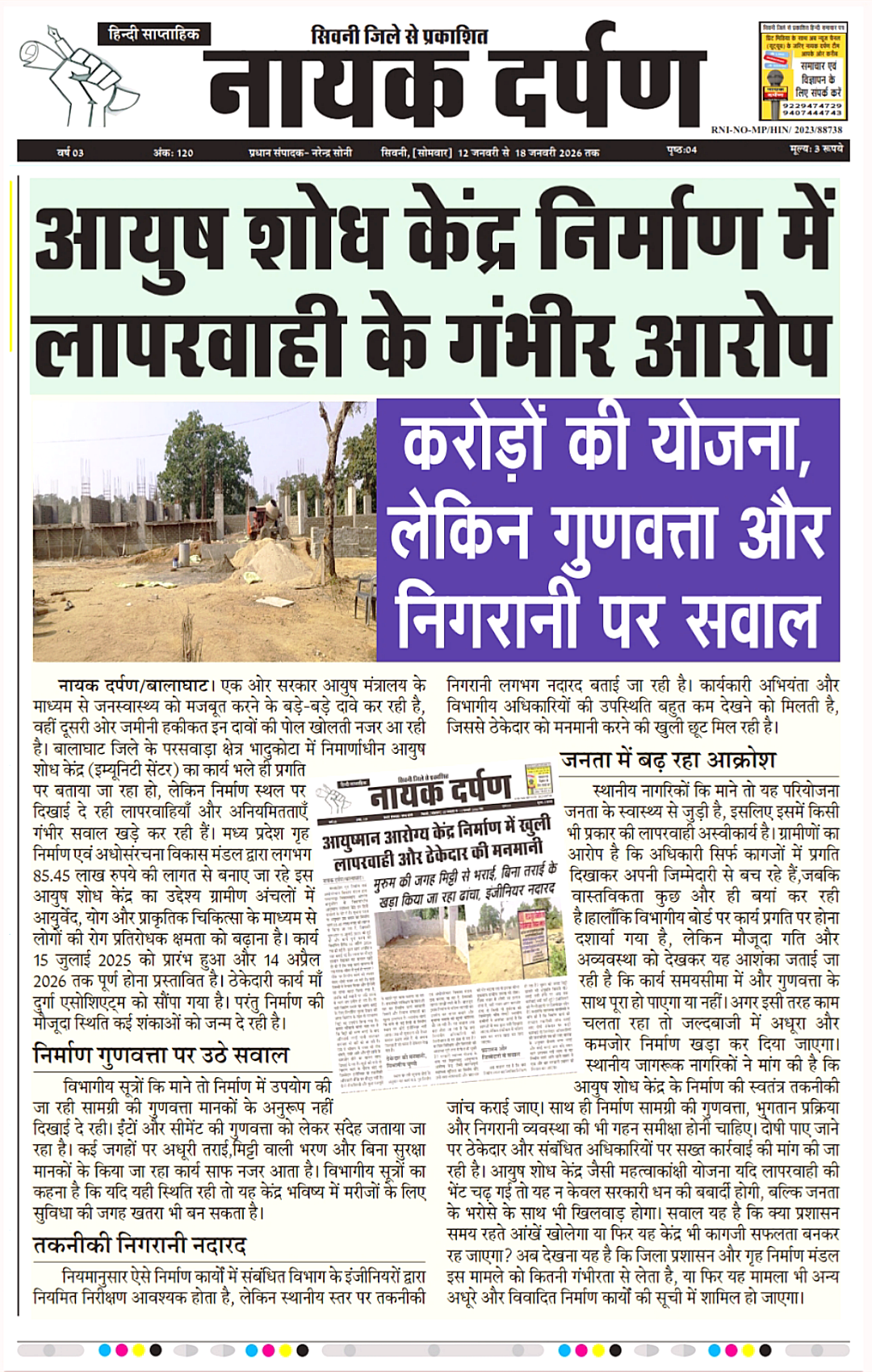 बालाघाट जिले में निर्माणाधीन आयुष शोध केंद्र (इम्यूनिटी सेंटर) अब जनस्वास्थ्य की उम्मीद से अधिक राजनीतिक संरक्षण और प्रशासनिक लापरवाही का प्रतीक बनता जा रहा है। आयुष मंत्रालय की महत्वाकांक्षी योजना जिसका उद्देश्य ग्रामीण अंचलों में रोग प्रतिरोधक क्षमता बढ़ाना है वही योजना आज ठेकेदारों और अधिकारियों के लिए कमाई का साधन बनती नजर आ रही है।परसवाड़ा क्षेत्र भादुकोटा में 85.45 लाख रुपये की लागत से बन रहे इस केंद्र का निर्माण मध्य प्रदेश गृह निर्माण एवं अधोसंरचना विकास मंडल से मिली स्वीकृति और निर्माण कार्य संविदाकार मां दुर्गा एसोशिएट्म् द्वारा कराया जा रहा है। कागजों में कार्य प्रगति पर है बोर्ड पर तारीखें चमक रही हैं लेकिन जमीनी हकीकत सरकारी दावों को मुंह चिढ़ा रही है।