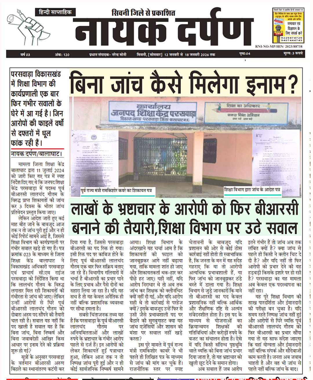 नायक दर्पण की टीम इस घोटाले की परतें उधेड़ने को तैयार है। अगले अंक में हम खुलासा करेंगे कि कैसे लालचंद गौतम ने बीआरसी पद के आड़ में भ्रष्टाचार कर लाखों रुपये हजम किए। लेकिन सवाल यही है जांच क्यों नहीं हो रही? क्या बालाघाट शिक्षा विभाग भ्रष्टाचार का अड्डा बन चुका है? जनता मांग कर रही है तत्काल निष्पक्ष जांच हो,दोषियों पर सख्त कार्रवाई हो,वरना यह लापरवाही पूरे सिस्टम को खोखला कर देगी। समय आ गया है कि सरकारी कुर्सियां हिलें और भ्रष्टाचार की दीमक साफ हो!