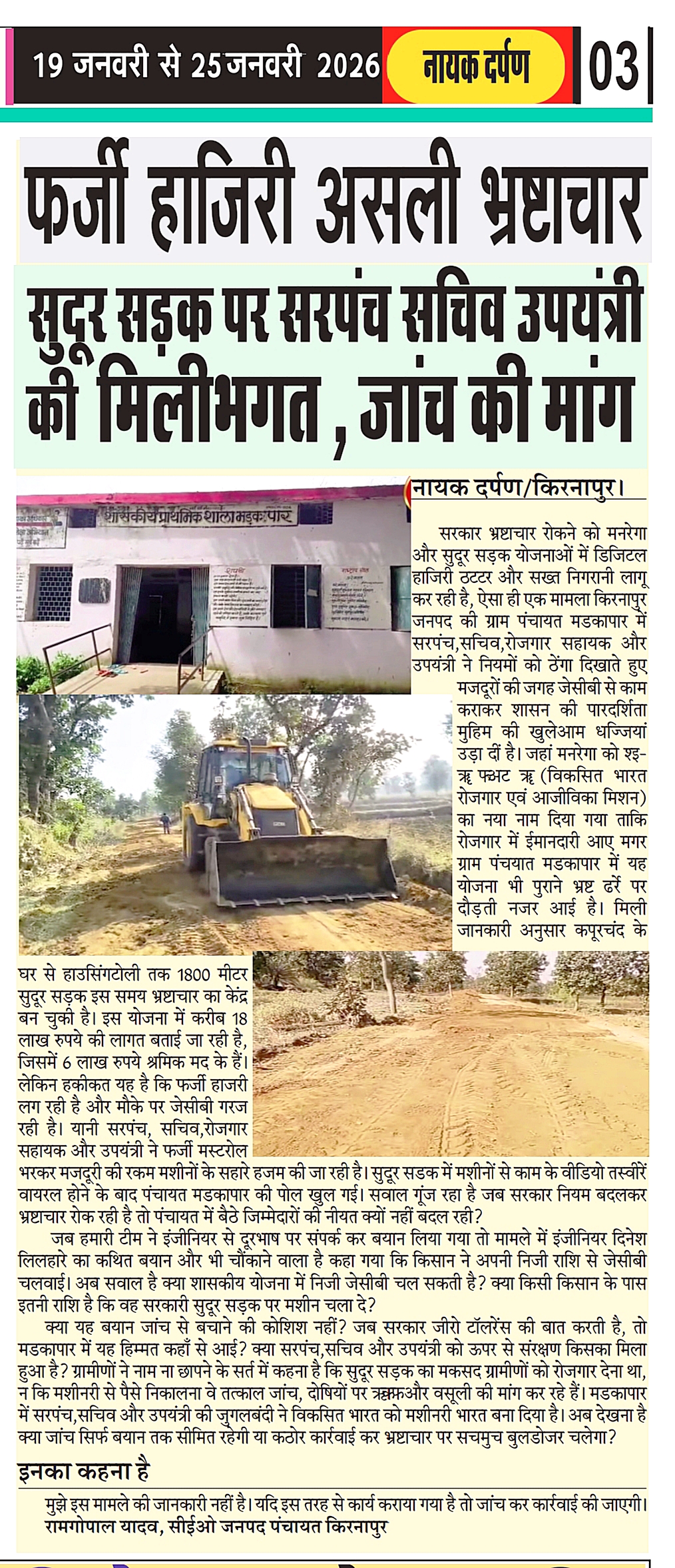किरनापुर जनपद की ग्राम पंचायत मडकापार में मनरेगा सुदूर सड़क निर्माण कार्य में सामने आए जेसीबी कांड ने अब एक नए मोड़ पर विवाद खड़ा कर दिया है। श्रमिक आधारित योजना में खुलेआम मशीनों के इस्तेमाल के वीडियो और तस्वीरें वायरल होने के बाद जहां ग्रामीणों में आक्रोश है, वहीं जिम्मेदारों की ओर से लगातार दिए जा रहे विरोधाभासी बयान पूरे प्रकरण को जांच से पहले बयानबाजी और लीपापोती की ओर ले जाते नजर आ रहे हैं। सवाल यह नहीं है कि मशीन चली या नहीं बल्कि यह है कि नियमों के इतने खुले उल्लंघन के बावजूद अब तक किसी पर ठोस कार्रवाई क्यों नहीं हुई।