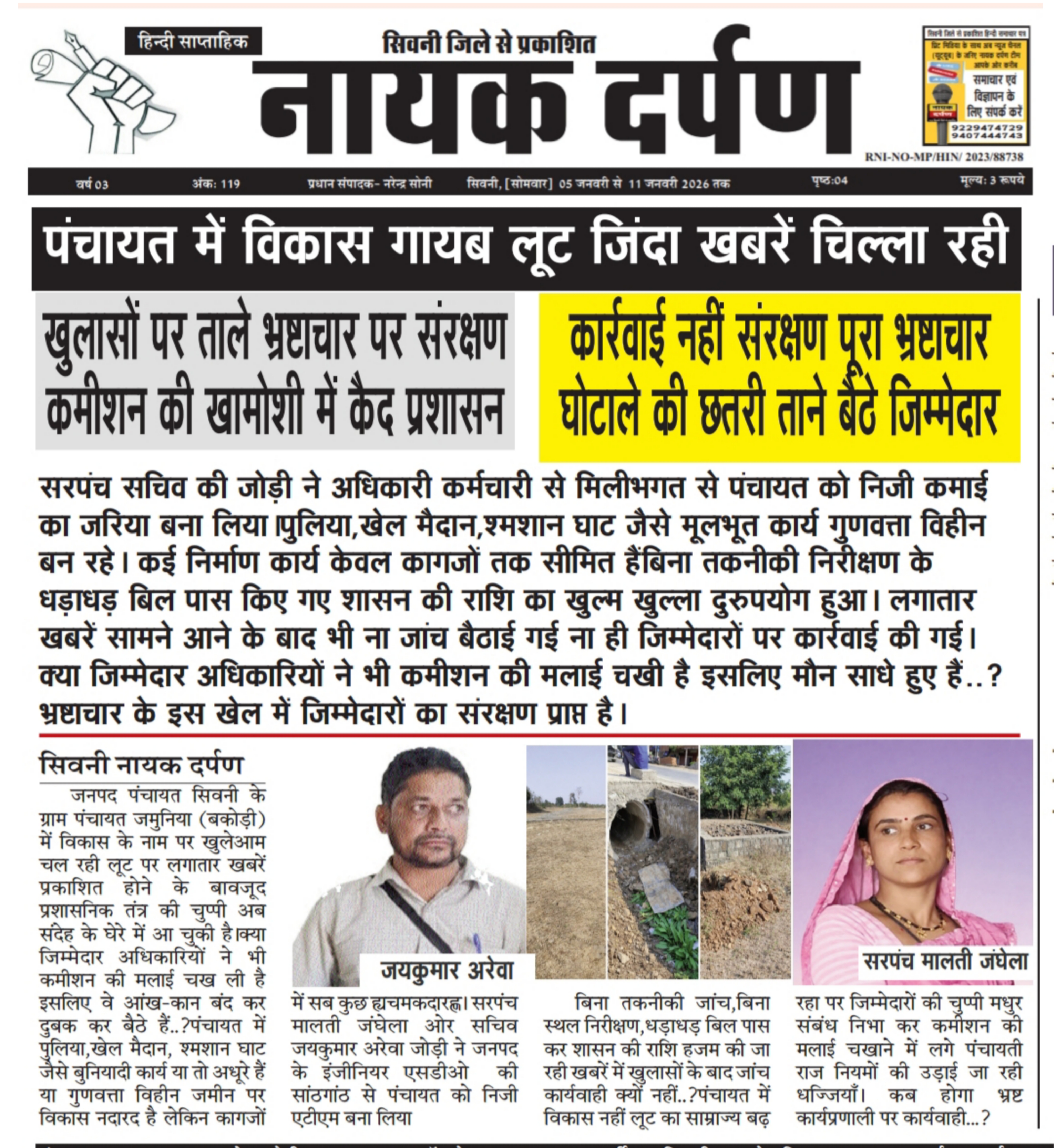 जनपद पंचायत सिवनी ग्राम पंचायत जमुनिया (बकोड़ी)में सरपंच मालती जंघेला और सचिव जयकुमार अरेवा के कार्यकाल पर सवालों की बाढ़ ग्रामीण हितों को दरकिनार कर शासन की राशि अपने हित में हजम की गई। गुणवत्ता विहीन पुलिया,अधूरा खेल मैदान और शमशान घाट जैसे बुनियादी कार्यों में भारी अनियमितताएं सामने आई हैं।