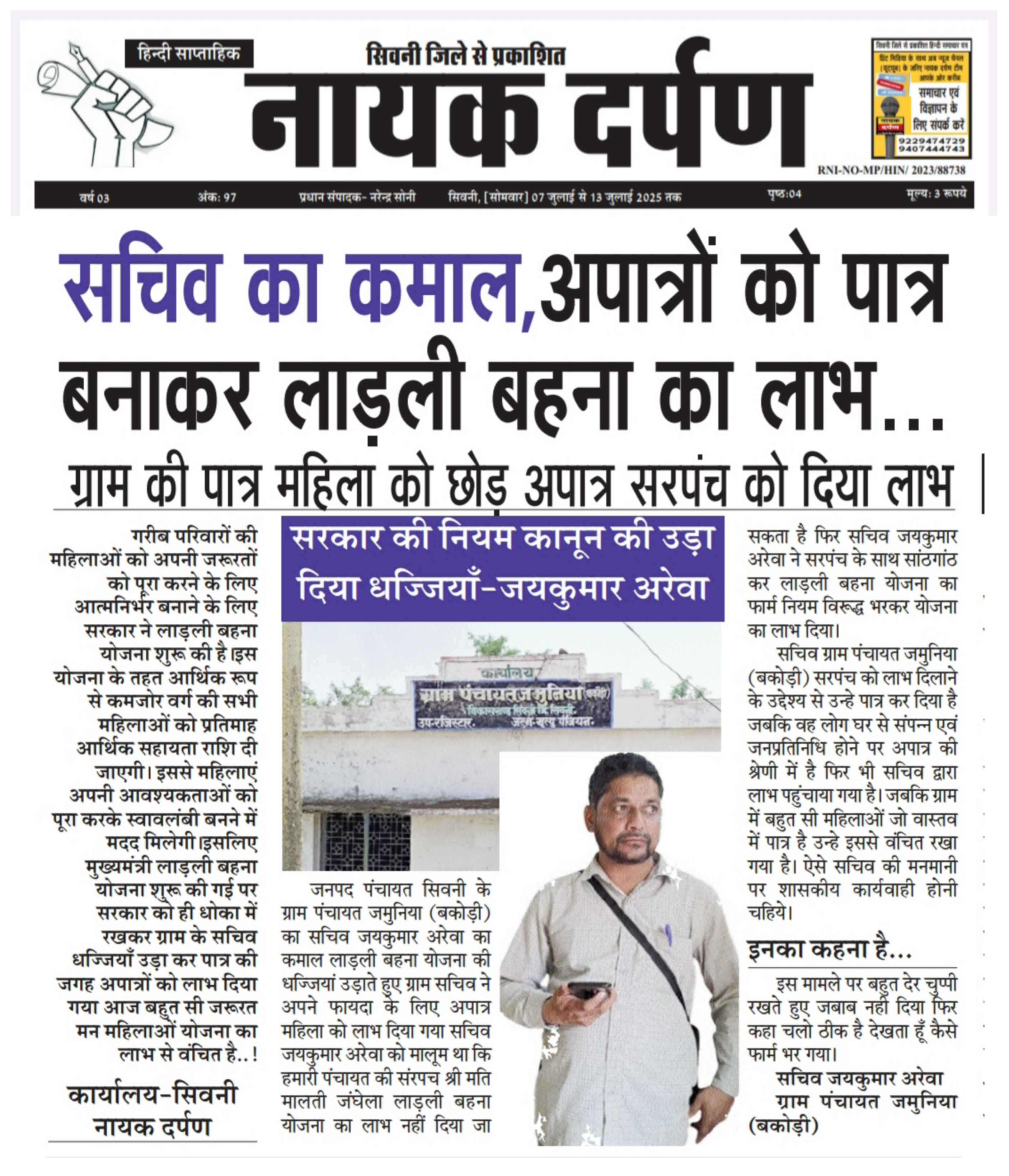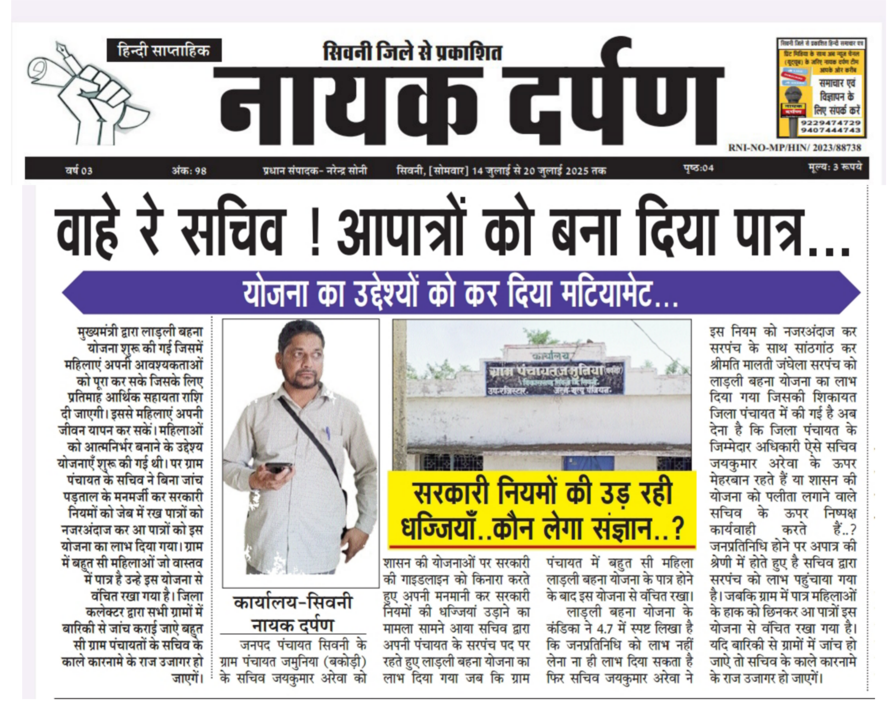सूत्रों के अनुसार लाड़ली बहना योजना का लाभ सरपंच ने स्वयं लिया,इतना ही नहीं अपने परिवार के सदस्यों को भी लाभ दिलाया गया जबकि पात्र ग्रामीण महिलाएं आज भी वंचित हैं। सवाल सीधा है जो सरपंच अपने घर की झोली भरने में व्यस्त हो, क्या वह गांव का विकास कर पाएगा..?